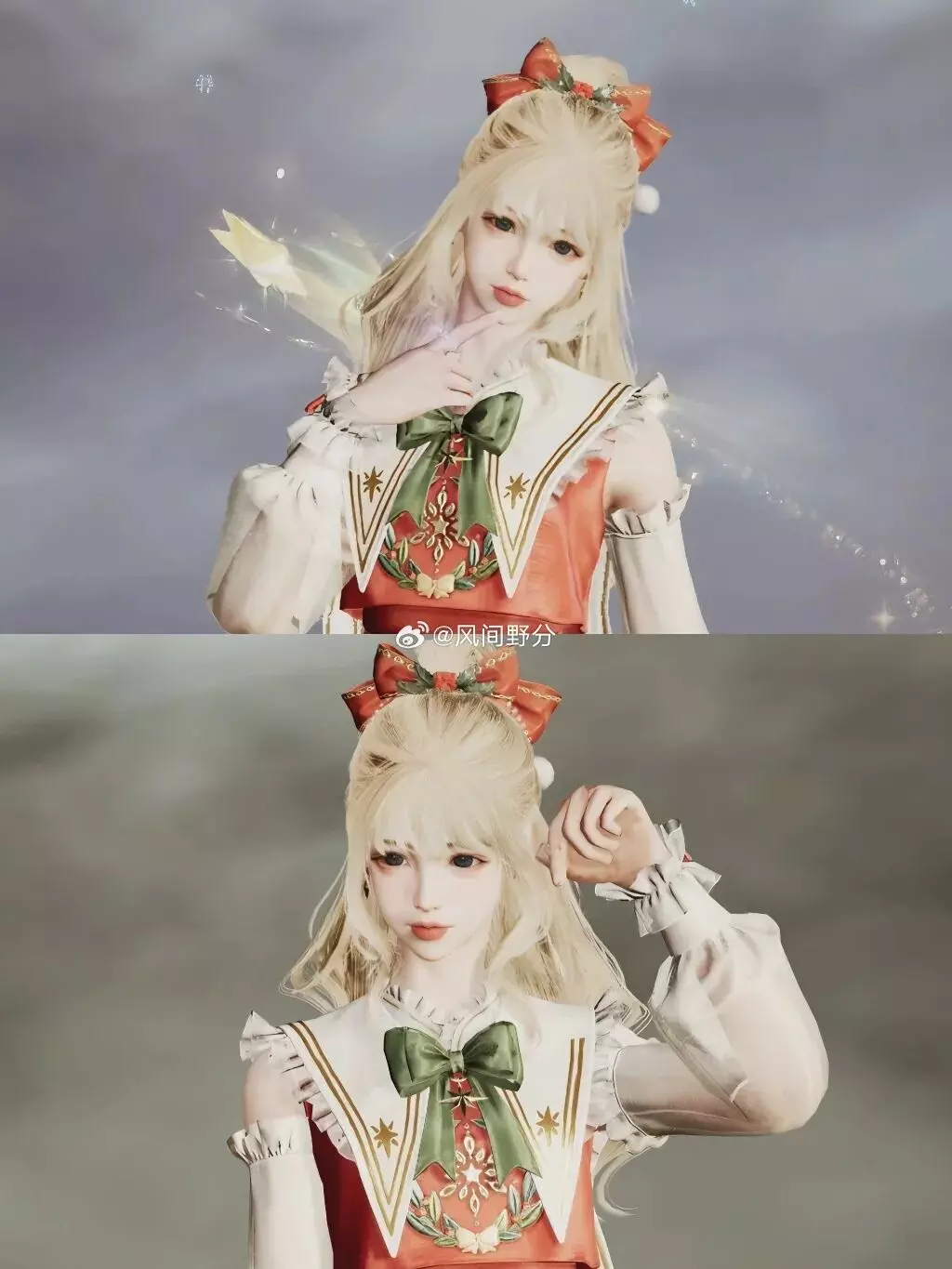 淡金色长发点缀红色蝴蝶结