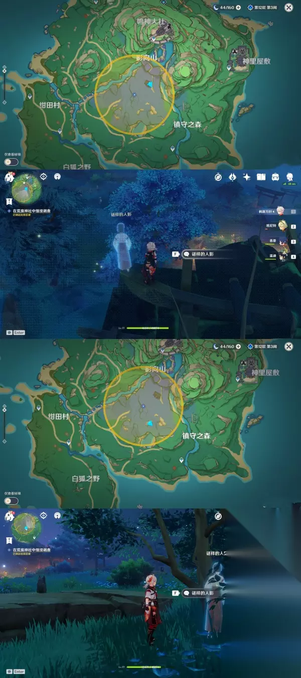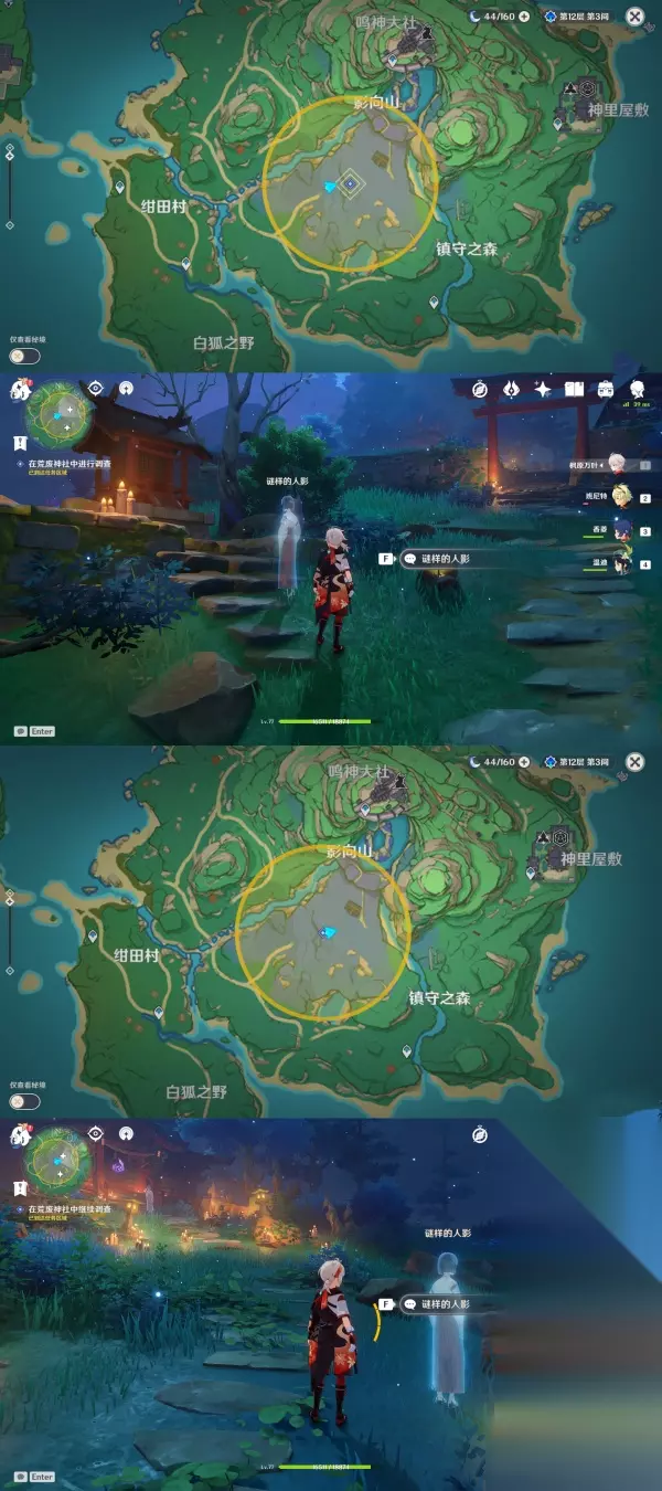 第一个谜样的人影:第一次对话位于「荒废神社入口」,第二次对话位于「入口再往里一点」