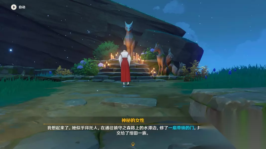 ▲ 2.寻找「巫女-稻城萤美」-位于鸣神大社 拿着神樱大祓要略找到稻城萤美,她会给你一个「留念镜」(非常重要),透过留念镜,会出现原本不存在的事物 使用方式:打开背包-道具栏,把留念镜装备上,先开启元素视野发现特殊的(显示白色)「地狐雕像」,然后再去扫描,也可以直接通过外观来判断,发着光的也是可以交互的