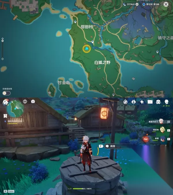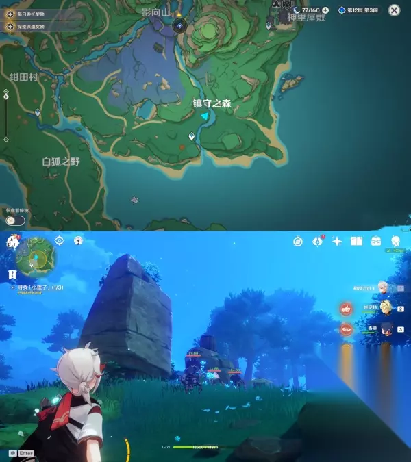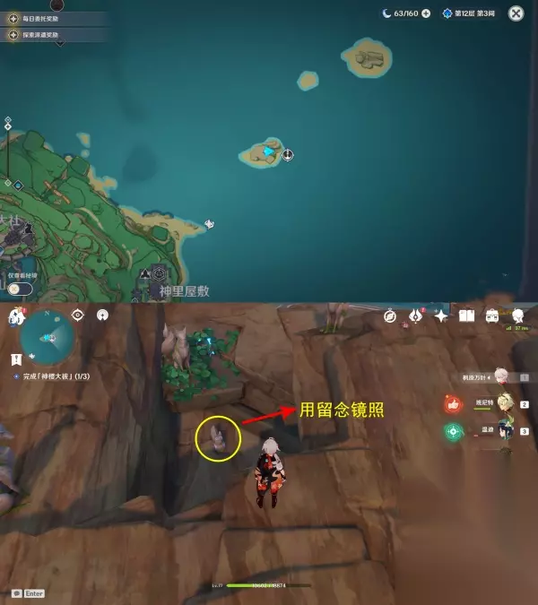 接着去寻找结界入口,开浪船来到小岛上,找到图中的地狐雕像,用留念镜照它 环境提醒:洞里的雷元素浓度过高,旅行者会受到雷祸的侵蚀,探索过程中一定要找到雷樱枝条召唤出雷种子来抵御雷祸