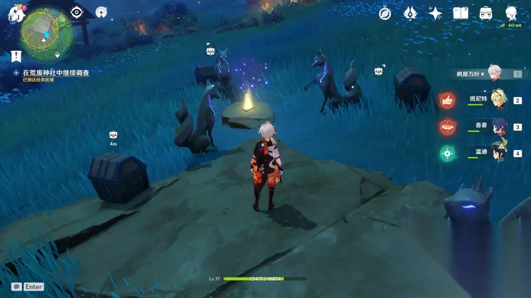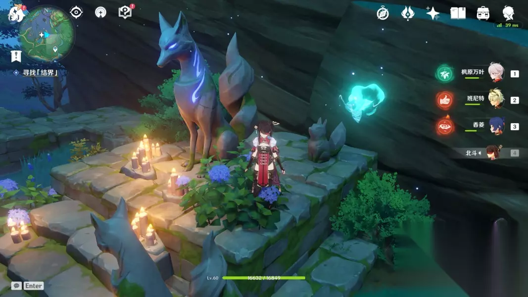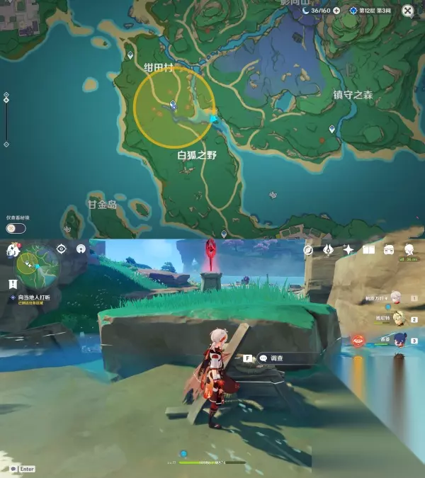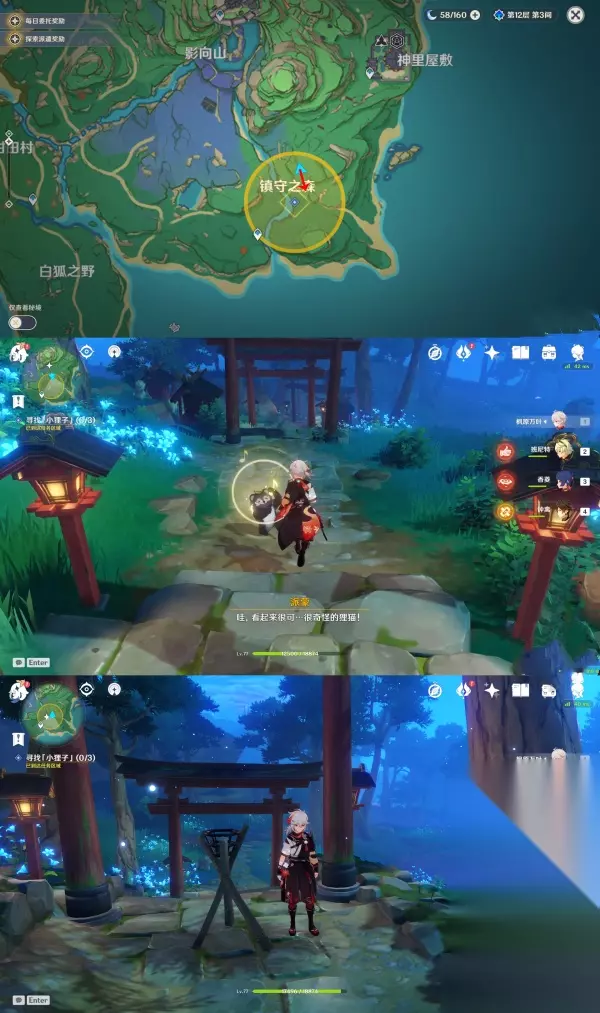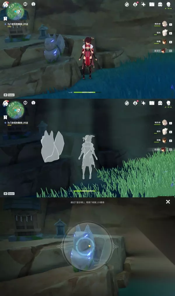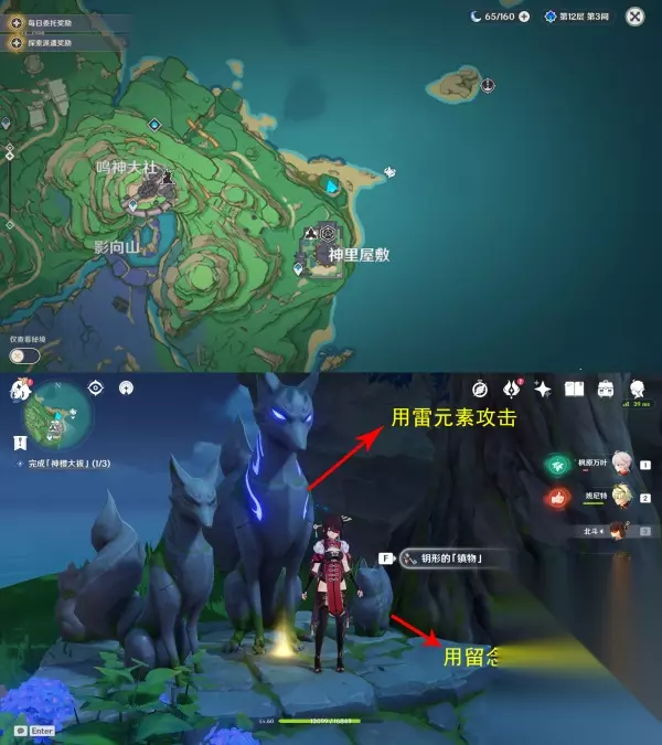 ▲ (四)祓行-破除剩下两个结界 1.第二个结界位于「神里屋敷之外的滩涂地下」 先去神里屋敷下的滩涂上找到镇物,用留念镜照地狐雕像,这时候会出现天狐雕像,然后用雷元素攻击它,获得镇物