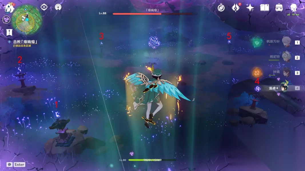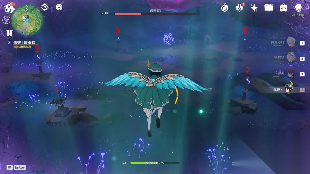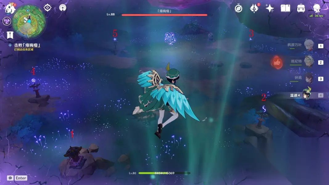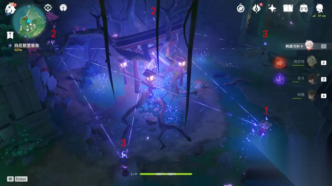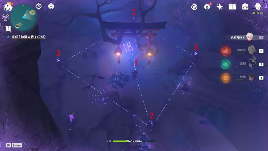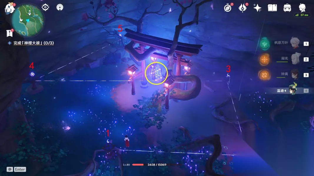 回去绀田村井底找花散里 ▲ (五)影向祓行-最后的祝祷 1.前往影向山底部的裂口-解除洞口封印 与花散里对话,接着跳进底部,降落至洞口的时候记得拿雷神瞳 2.清除「瘴晦瘤」-进行三次祝祷 这里的祝祷不需要镇物,祝祷前需要击败武士,每次祝祷完,瘴晦瘤会掉下来,这时候尽全力攻击它,血量掉到一定时会重新升上去,接着进行下一次祝祷,一共要进行三次,方能消灭瘴晦瘤。 *第一次祝祷结束后,「瘴晦瘤」也会参加战斗,每隔一段时间会发出数枚毒球 *环境提醒:底部的雷元素浓度过高,旅行者会受到雷祸的侵蚀,记得找到雷樱枝条召唤雷种子来抵御雷祸 第一次祝祷如图所示,调整祝祷座的勾玉数量,记住先不要跟1号交互!!先调整其他祝祷座的勾玉数量 *战斗提醒:1个落武者·祟炎