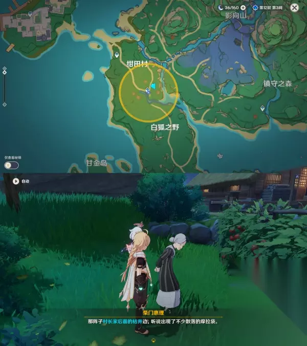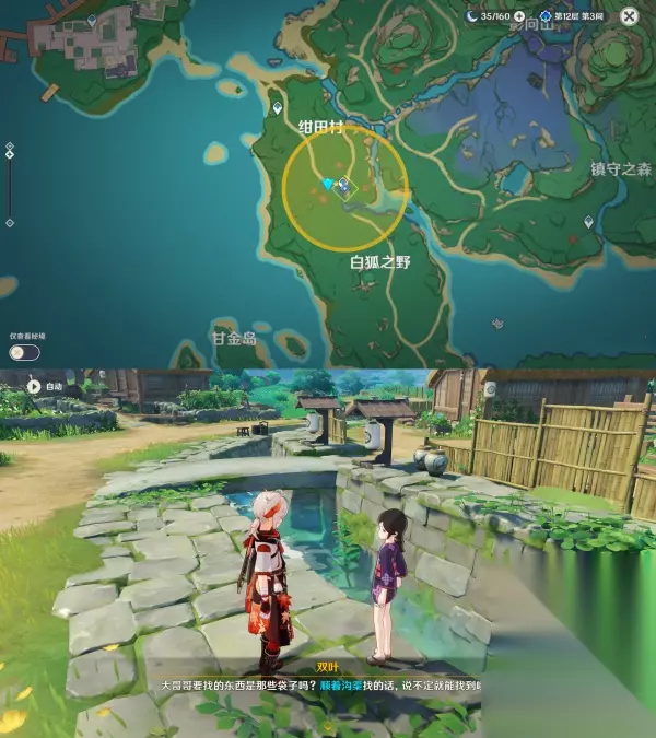 ▲ 2.前往绀田村向当地人打听,获取线索 第一个当地人「双叶」位于沟渠旁边 *跟双叶对话完会让你去找村长,此时的村长不肯透露村子情况