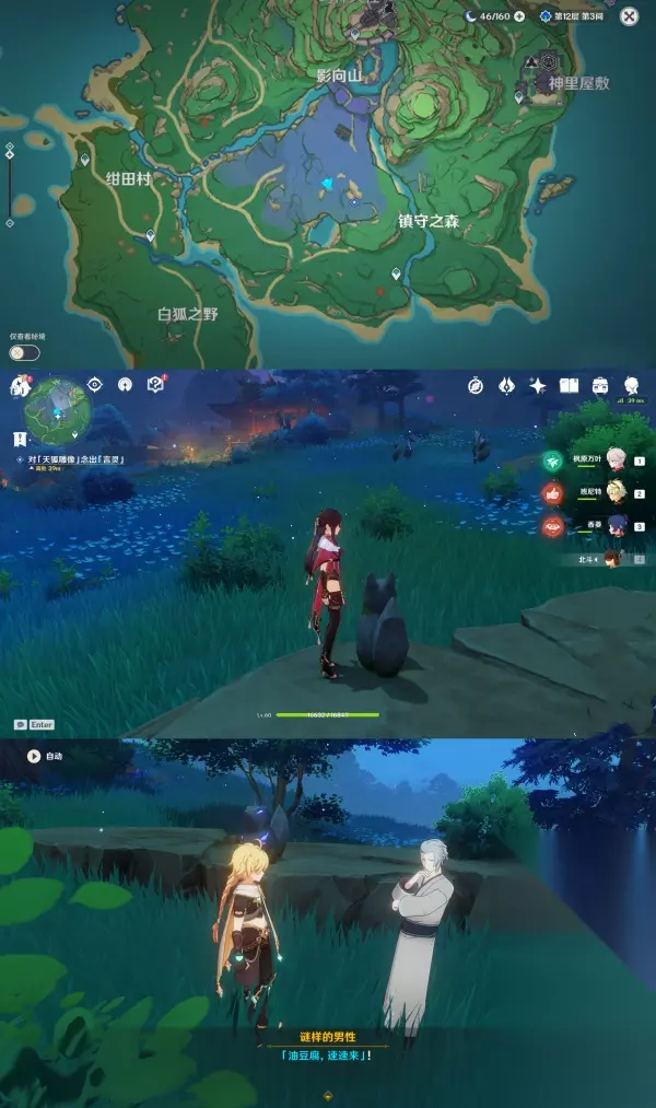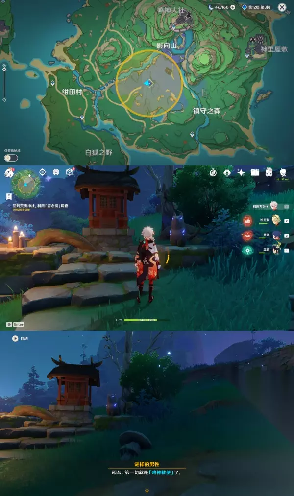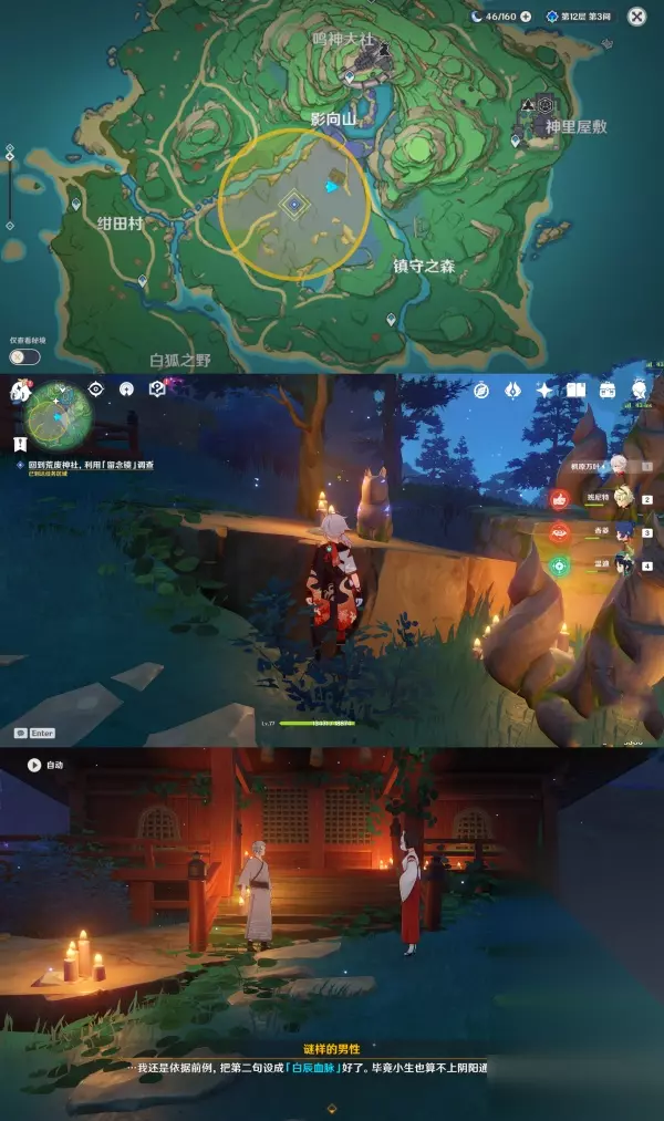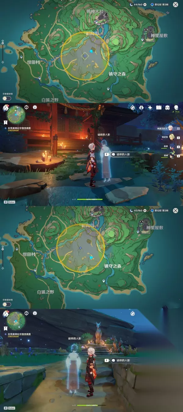 第三个谜样的人影:第一次对话位于「荒废神社房顶」于,第二次对话位于「天狐雕像右边的树后」