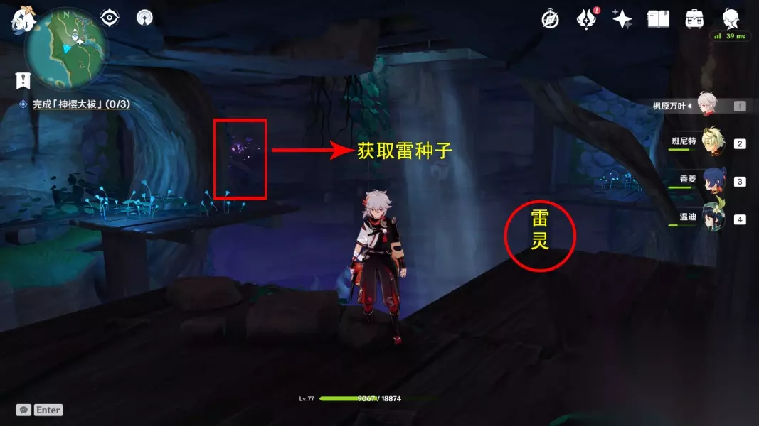 来到里面会看到雷灵,跟着雷灵走就可以找到雷樱枝条,先拿雷种子,再跳下去