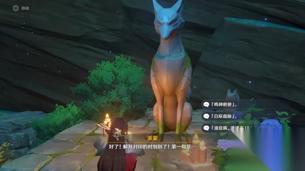 来到「天狐雕像」,按顺序准确念出言灵,然后拿到镇物(如果没看到镇物的话就用雷元素攻击天狐)