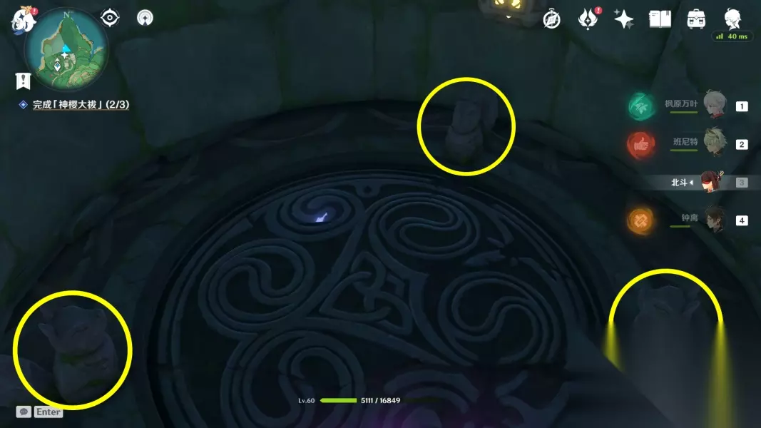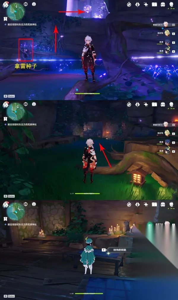 此时我们就来到荒海地下了,落地后旁边有个地狐雕像(黄圈),一照就出现雷樱枝条,召唤出雷种子穿越若雷结界,用雷元素攻击天狐雕像(红圈)获得镇物