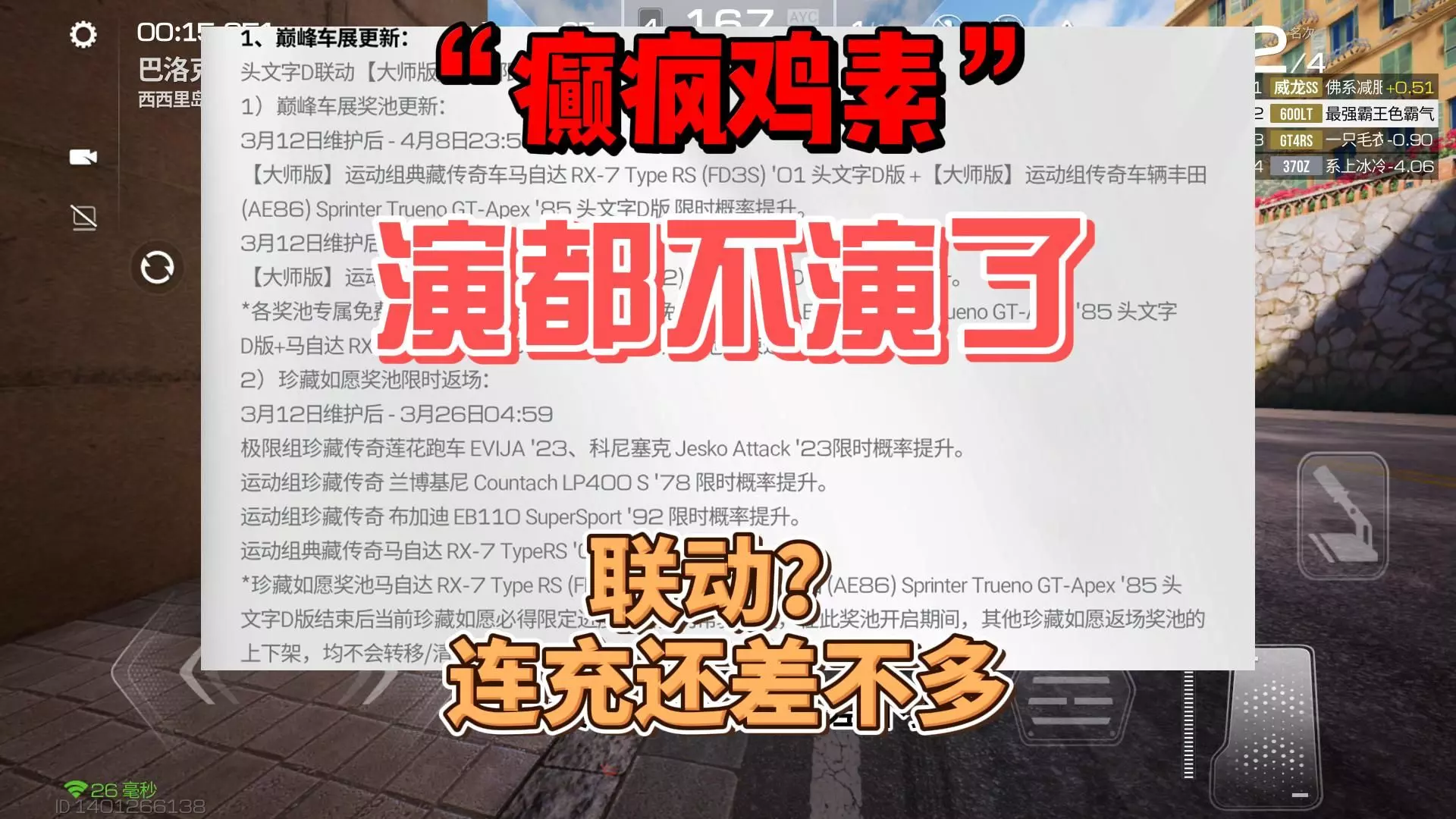 这是《巅峰极速》头文字D联动相关内容,盘点了游戏里十大“难开”的车,上集里介绍了如兰博基尼盖拉多等车型,提及部分车辆“开局巅峰,后续癫疯”的驾驶体验,还有官方对地图路肩的修复内容。