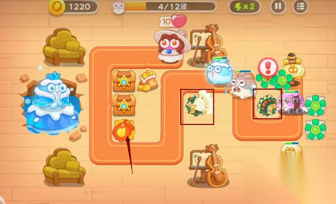 保卫萝卜4阿波尼克号20关怎么过 通关步骤介绍: 1、开局在图片标记位置种上两个风扇塔,升满级