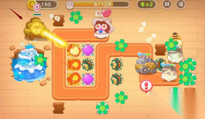 2、获得足够萝卜币后,在标记位置种上两个多重箭,升满级,打开左边的宝箱里面是火瓶子