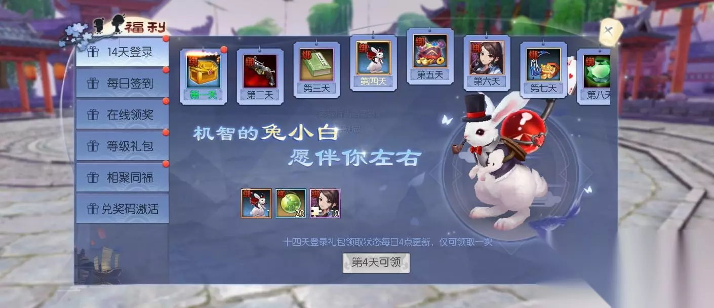 自从《武林外传》手游上线以来,就得到了广大玩家的热烈支持和喜爱。这篇文章旨在为那些还未开始游戏的新玩家提供一份简单的新手指南,帮助他们在《武林外传》手游中更快地提升等级,变得更强大! 想要变强、快速摆脱“萌新”的玩家老爷们接着往下看吧! 好礼助萌新 新建角色累计登录达到对应天数,即可领取对应奖励。累计登录第四天,可以获得永久坐骑【兔小白】!
