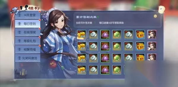 在福利面板中,每日签到还可以领取签到奖励,有绑定元宝、银币、侠影等奖励。每日凌晨4点前可以领取奖励,每日可以补签一次。