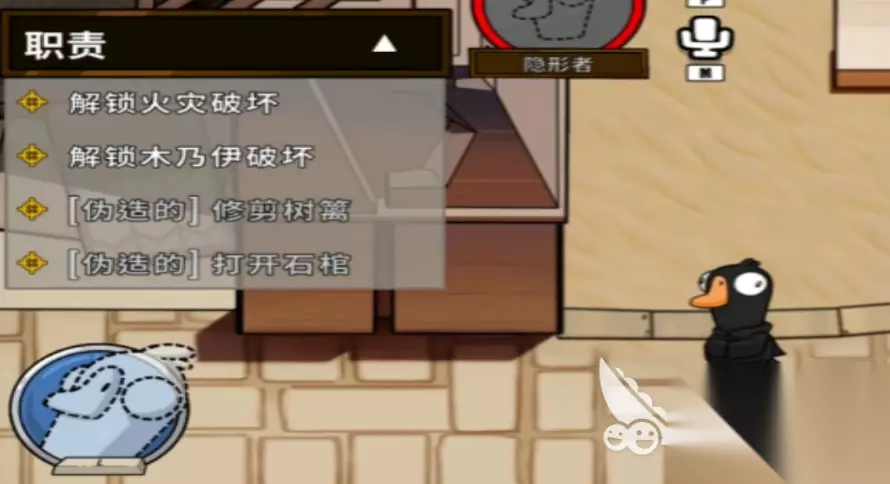 玩家成为隐形鸭的时候,在鹅鸭杀手游当中要了解他的技能,比如他能够持续5秒钟的时间直接隐身。并且在隐身的状态下,它的移动速度也将会大幅度的提升,简单来说就是隐形鸭在隐身快速接近目标或者是逃离危险的时候,这个技能其实能够有效的帮助他。虽然隐身的技能具备一定的优势,但是它其实也具备代价,而他所看到的视线全部都是灰色的,在这样的情况下,他不能够看到队友,也不能够看到敌人。