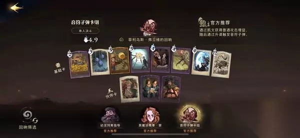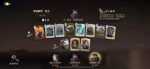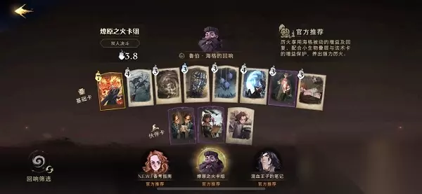 推荐理由: 理由石墩出动在前场进行抗伤,保证斯内普的普攻持续输出,配合时间转换器可以造成大量输出。 T3、鲁伯海格的回响卡组 卡牌组合: 厉火、灵猫、门钥匙、康沃尔郡小精灵、小蜘蛛群、盔甲护身、除你武器、白鲜香精、弗雷兄弟、洛蒂特纳、丹尼尔佩杰。