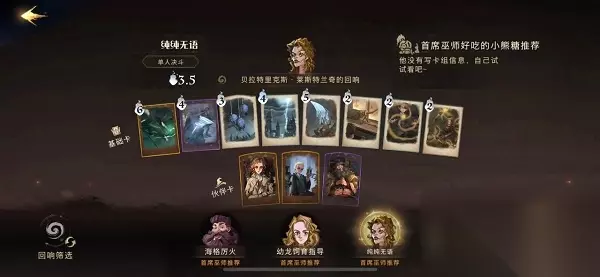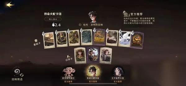 推荐理由: 开局优先释放凯文,迅速叠满凯文获得普攻加成,再通过多比回响灵活进行拉扯和配合时间转换器进行输出。 T2、西弗勒斯斯内普的回响卡组 卡牌组合: 石墩出动、神锋无影、八眼巨蛛的毒液、闪回咒、凤凰、飞来咒、时间转换器、充气咒、凯文法雷尔、弗雷兄弟、格洛普。