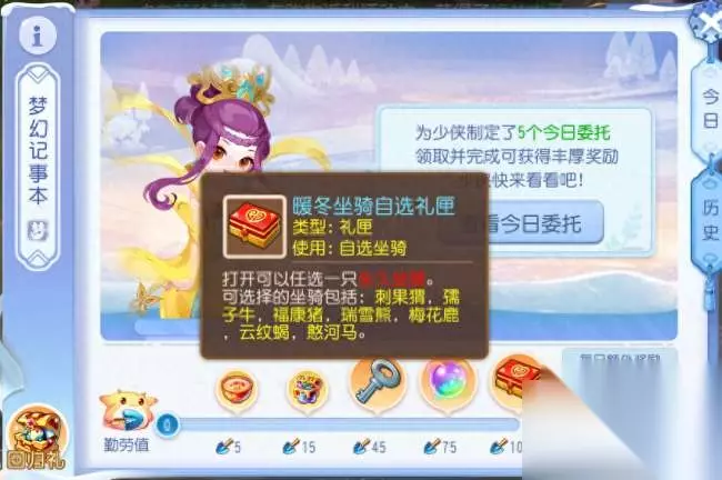 并且本期记事本也很良心,只要完成委托,积累100值,就可以领走银钥匙。幻色丹还有最终的坐骑自选礼盒。