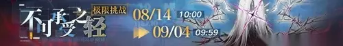 活动时间:08月07日开服后至09月04日09:59 活动说明:活动期间新增狂厄级禁闭者【奥古斯特】【幽冕·海拉】、高危级禁闭者【希格林德】疑凶追影试炼行动,参与挑战并通关即可获得异方晶奖励。 「不可承受之轻-极限挑战」限时活动