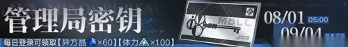 活动时间:08月07日开服后至09月04日04:59 活动说明:活动期间累计登录达7日共可领取【折章契引×14】,完成14日累计登录还可领取异方晶、留影胶片等奖励。 「管理局密钥」三周年免费月卡