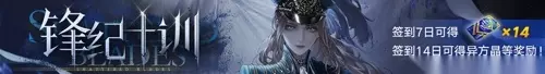 活动时间:08月07日开服后至09月04日04:59 活动说明:局长在活动期间进行登录即可在活动页面中领取限定登录奖励【折章契引×10】。 「锋纪十训」限时签到活动