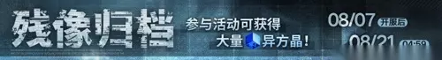 活动时间:08月01日05:00至09月04日04:59 解锁条件:通关主线章节1-4「接触· 彼岸」 活动期间,局长每日登录可以领取管理局发放的特别补给,每日可领取【异方晶×60】【体力补给Ⅳ型x1】,最大可以领取30次,领取次数达到上限后将无法继续领取 「残像归档」限时福利活动