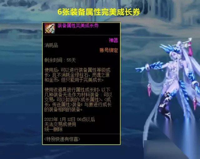【一】欢乐代币券888。在24号版本更新后,只要登录的玩家,即可无条件领取888点欢乐代币券,虽说数量不是很多,但至少是策划的心意。可以去买土罐的魔盒,来进行搏一搏,万一开出高价值道具,“单车就能变摩托”。觉得这一期魔盒中,限定道具没好东西的,可以先买土罐的魔盒放着,等出好道具再开。 【二】装备属性完美成长券6个。这是一个好东西,能够完美的喂养,不需要消耗金绿柱石和金币,相当于节省了成本。