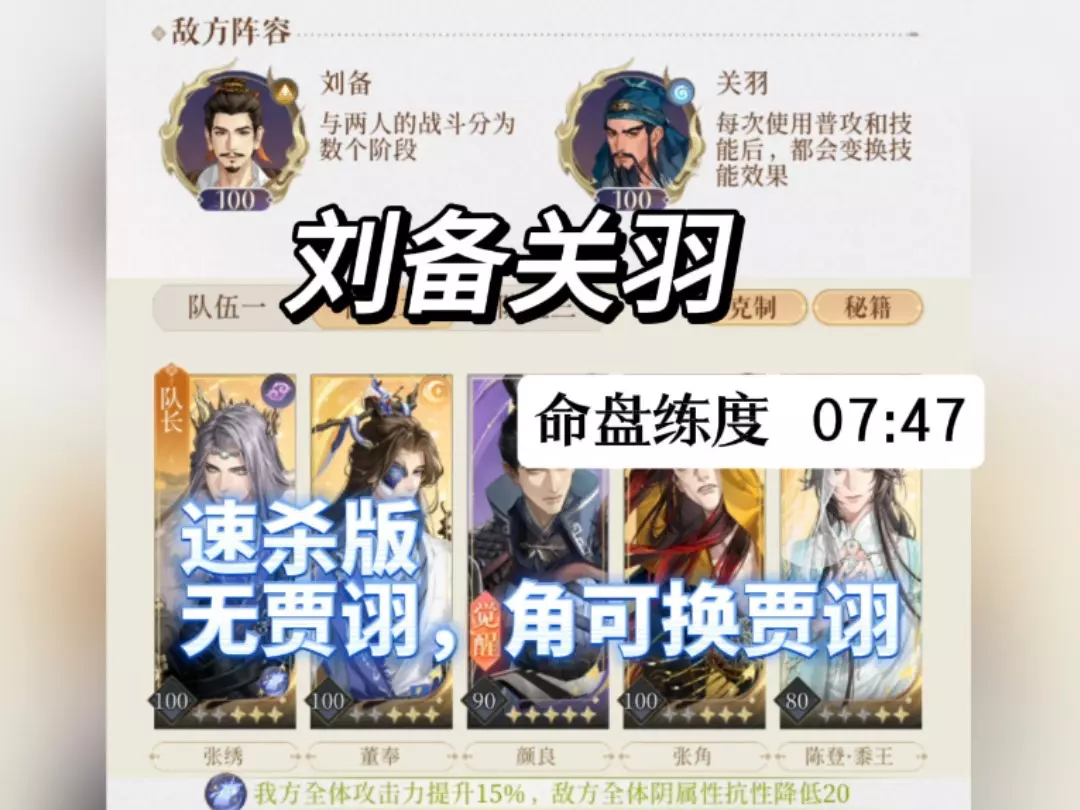可以直接上,重点是控血,徐庶颜良九十级:练度再低一点也可以,徐庶谋无敌少剑气完美盘,颜爹攻击回血,修猫加二技能额外伤害加技能大幅,张邈道同加三风属性,登哥加一加…