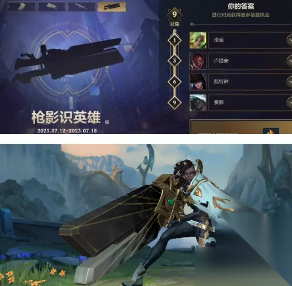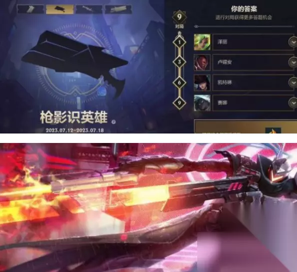 在英雄联盟手游中最近开启了一个“枪影识英雄”的活动,其中玩家要根据英雄的武器来识别对应的英雄是谁,答对可以领取丰厚的奖励,接下来小编为大家带来了详细介绍。 活动时间:2023-07-12至2023-07-18(英雄身份将于2023-07-17 0点揭晓) 解锁方法:完成对局1-3-6-9场可以解锁对应枪影,一共是四个英雄 答案大全: 1、第一个枪影英雄:泽丽 这是泽丽标志性的武器,武器前端有凹槽,玩过泽丽的玩家应该对这个很熟悉。