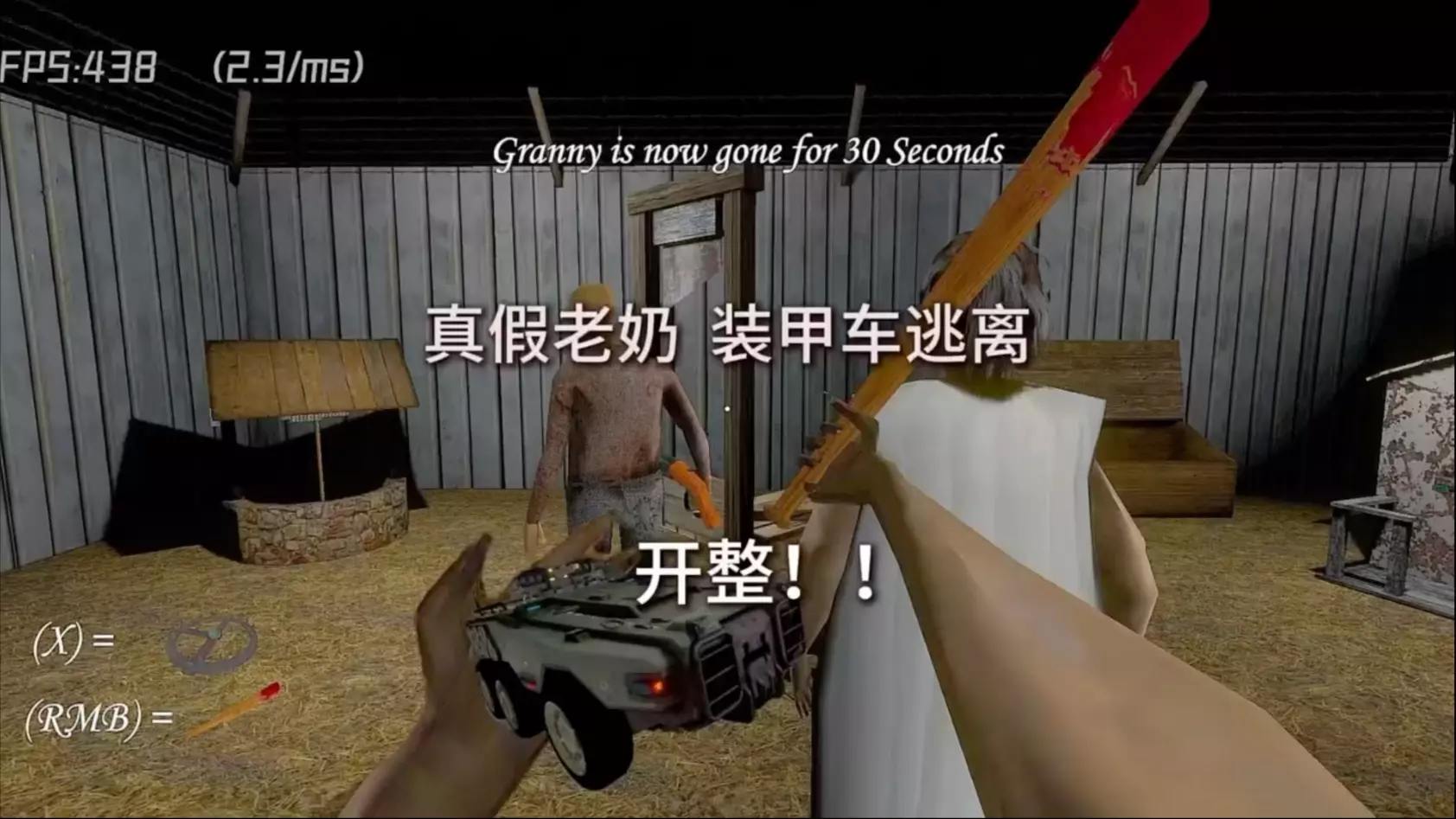 这是《恐怖奶奶2025重制版》的游戏内容,展示了玩家扮演猎枪爷爷,在昏暗阴森的场景中探索,最终尝试驾驶装甲车完成逃离的游戏过程。