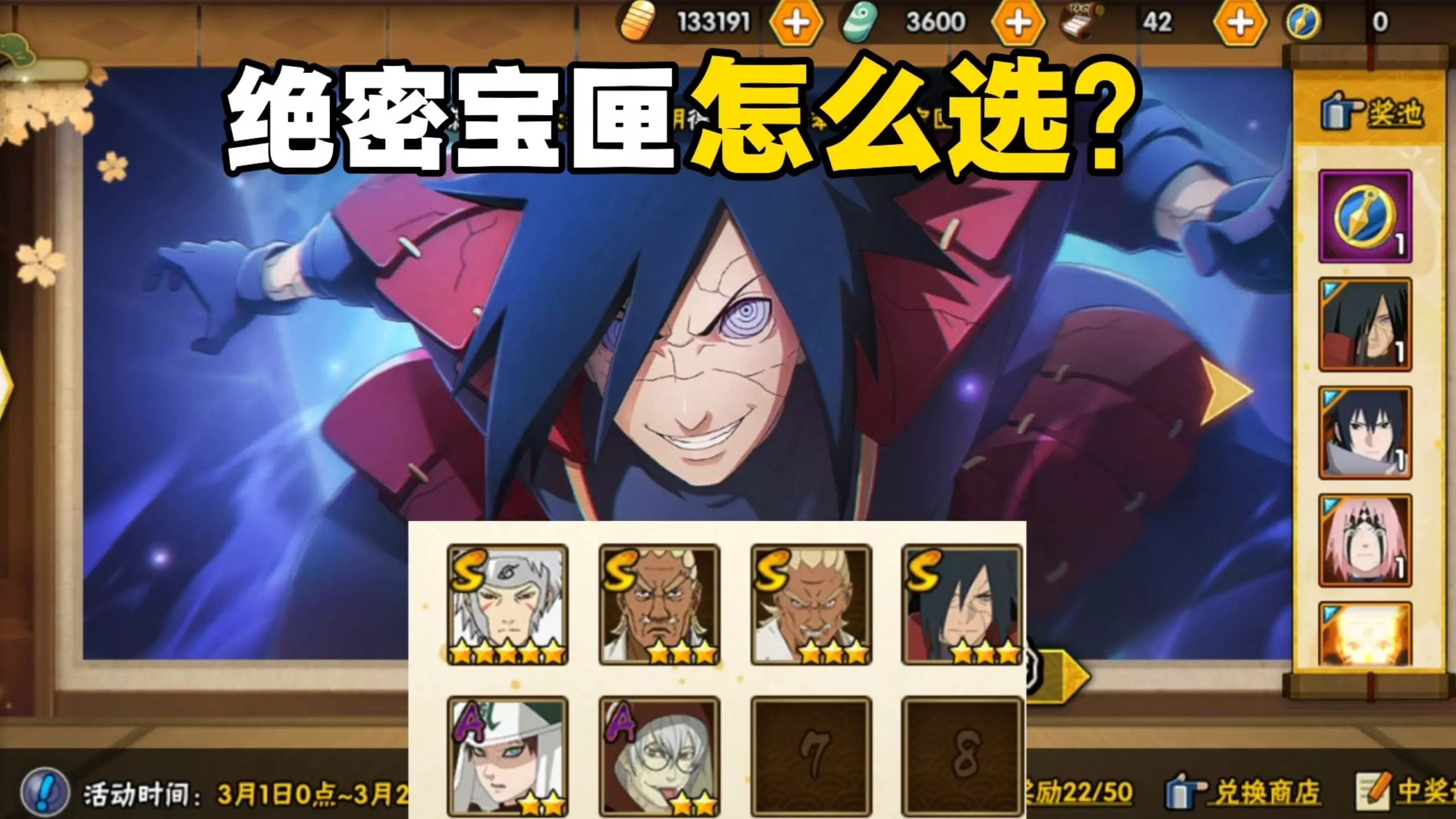 那么5.20就即将开始签到领高招a忍的活动了,青水之前的高招a都是可以选的,那众多忍者到底选哪一个呢? 决斗场强度:第一梯队:青年水门、佐助须佐能乎、黑土、秽土…