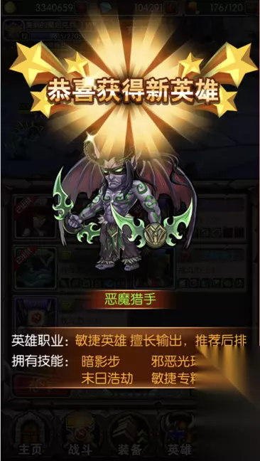 恶魔猎手是VIP礼包内的英雄,如果你人品好的话可以在魂石招募中获取到他。他属于一个强力的输出英雄,拥有四个技能分别为末日浩劫、暗影步、混乱打击、闪避。 是一个强力的AOE英雄,是一个不错的英雄。 拥有闪避技能在游戏初期缺少前排肉盾英雄的情况下可以暂时作为前排肉盾使用。 在游戏后期再武器附魔高暴击伤害的情况下可以起到快速清场的作用。