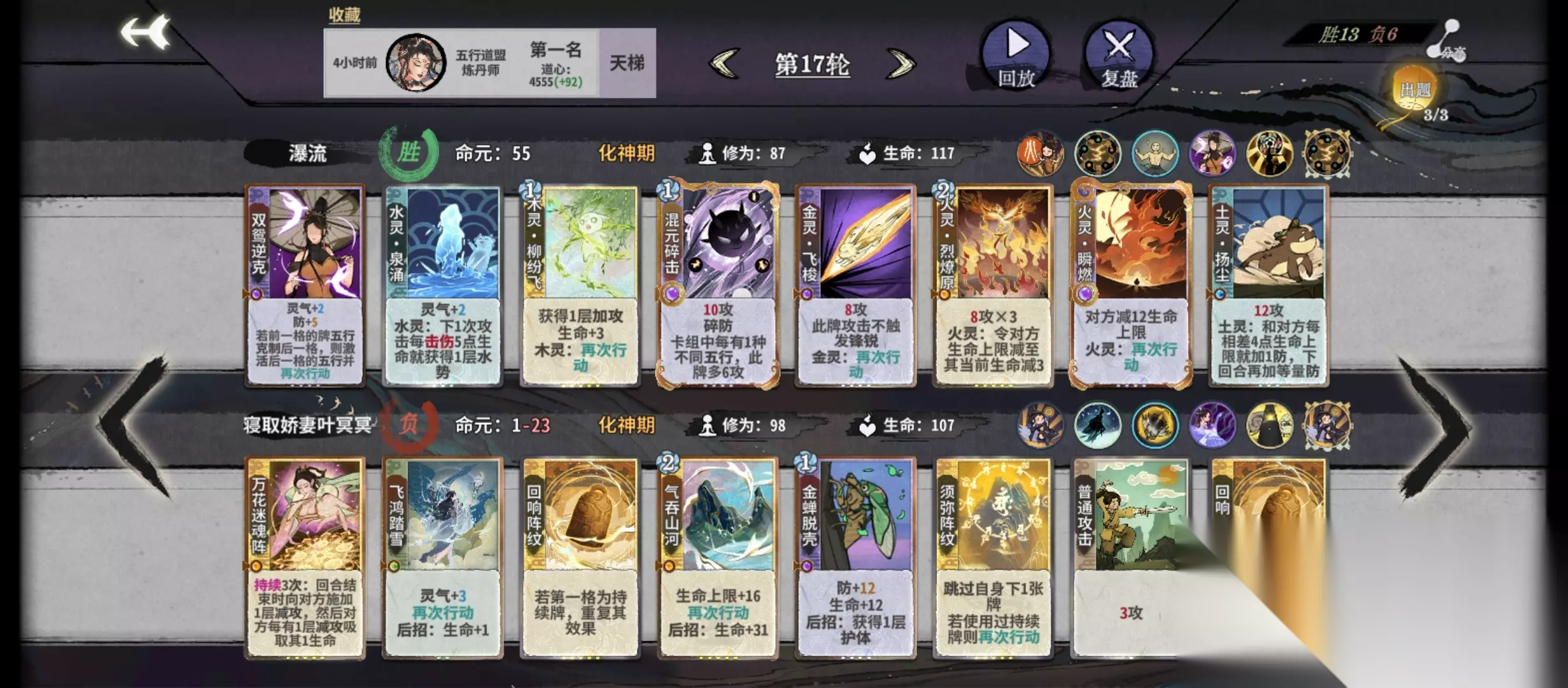 首先说新赛季我玩下来的感受:共鸣·五行印记(激活先天五行的相生相克五行)这个共鸣的存在,让杜怜鸳有了极高的上限,而共鸣·五行元灵可以在某些霉比情况重新投胎,有了保底。 这个赛季可以说是杜怜鸳最灵活,最强势的赛季了。 我甚至做好了这个攻略发出,鸳玩家集体提升被骂毒瘤,被骂超标求削的准备了—— 只能说,速来,早玩早爽! (注:本攻略为进阶攻略,新手可能看不太懂,阅读门槛是需要对五行盟足够了解,新手可以移步我去年发的杜怜鸳攻略) 首先说副职:无脑选丹。 其次说共鸣: 我一般会在第四回合看道蕴决定这把玩什么,来选共鸣。 角色专属共鸣: 1:五行灵阵(T3,没资格上桌,需要双阵的只有纯土纯金,这两个阵容缺点非常多,怕护体怕毒怕四动,喜欢玩纯金纯土出门右拐玩牢虎去,至少有仙命的上限) 2:五行元灵:(T2,我很少选,如果道蕴给天髓、腾浪、暗香,前几回合发牌不顺血量掉得多,那可以认怂。天髓可以转纯水纯火,腾浪转水,暗香转木) 3:五行印记:(T0,先天土,金,火必拿,拿了就奔泉涌混元碎击的套路靠,先天水,木,道蕴给混元碎击、柳纷飞、金灵·飞梭也可以拿。) 通用共鸣: 1:五行专一:先天水、木、火可以拿,往纯系靠,基本能保分,缺点刚需天髓,牌运不好容易暴毙。 2:锻体:先天水可以拿,仙命有顿悟拿顿悟,没有就奔着加生命的去,多久抗一动。 (通用属于霉比刷不到五行印记的妥协,保4就偷着乐) 仙命选择: 第一个仙命激活印记,任何情况都必点,不必犹豫。 如果玩纯系,第二个仙命选阵,第三第四选修为、速度、血量、换牌(顺序就是优先级) 玩混元,第三第四仙命选自带,第二仙命也是修为、速度、血量、换牌。 打法:鸳是元婴战神,不管是混元还是纯系,核心都在元婴,化神补强,所以元婴之前能不换牌就不换牌(我自己50血上元婴是常态) 由于鸳的可能性很多,本帖我只讲混元碎击套路的过渡思路 炼气多留金灵印、五行刺、水灵印(2级3灵配合木火耗灵牌) 筑基:水灵·汹涌,必留。 金丹:泉涌杨尘必留,断崖可以打工。 先天金、火、土且拿了共鸣·五行印记的情况下,元婴前注意留五个属性牌各一张免得上了元婴有混元没五行。 D牌思路就是不执着于一定要在元婴前找到刚需牌,前三轮每动收益有7就可以不D,丹的防血双消耗有就上。筑基后只要每动收益在9就可以不D。阵容关键卡找齐前优先D掉门派牌 消耗牌和断崖的防要注意对好对手的伤害,灵气牌靠后,前面先摆五行刺金灵印这些,这些细节要注意,容错往往就在每一轮的细节保出来。 成型阵容:我直接贴四个不同先天五行情况下点了共鸣·五行印记的标准四动杀公式图。至于博弈、牌没来全之前的妥协场,则需要你自己的基本功和对五行的理解,这个我教不了。
