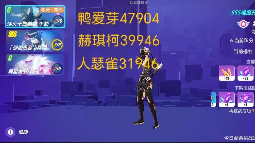 这是《崩坏3》的战场一档攻略内容,展示了用7S+9次爱芽、SSS游云搭配挑战SSS千劫的战斗过程,最终取得47904+的高分,还呈现了千劫暴怒状态的应对小贴士。