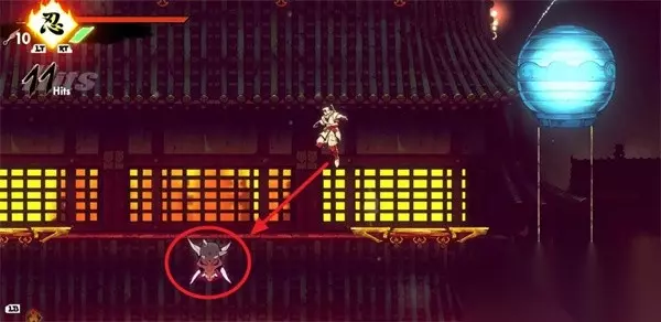 3、利用灯笼前进 完成挑战后,从右侧的灯笼把手跳上第一个屋顶。注意:蓝色灯笼可反复使用,紫色灯笼会下降,若在机关处掉落过低可能直接死亡。 4、找到秘藏宝箱 绕到第一个屋顶下方的平台,那里有一个【秘藏】宝箱。开启即可获得装束【烈焰奇袭】。