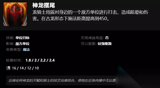 神龙摆尾 龙骑士用盾对身边的一个敌方单位进行打击,造成眩晕和伤害。在古龙形态下施法距离提高到450。