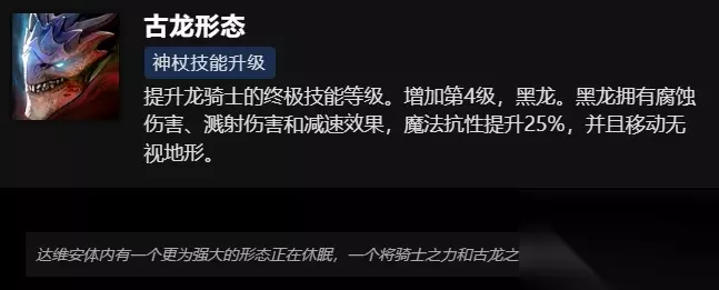 神杖技能升级 古龙形态 提升龙骑士的终极技能等级。增加第4级,黑龙。黑龙拥有腐蚀伤害、溅射伤害和减速效果,魔法抗性提升25%,并且移动无视地形。