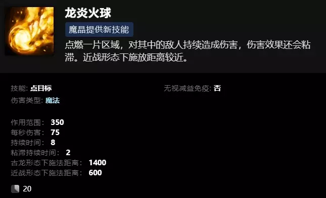 魔晶技能升级 龙炎火球 点燃一片区域,对其中的敌人持续造成伤害,伤害效果还会粘滞。近战形态下施放距离较近。