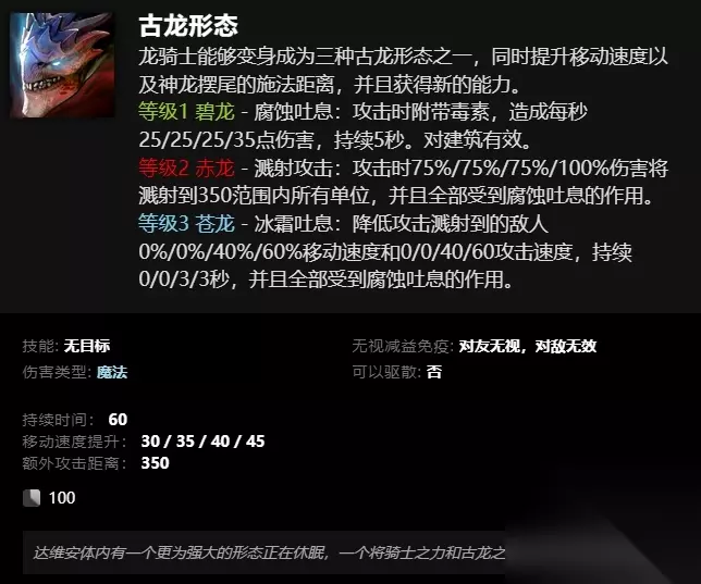 古龙形态 龙骑士能够变身成为三种古龙形态之一,同时提升移动速度以及神龙摆尾的施法距离,并且获得新的能力。 等级1 碧龙 - 腐蚀吐息:攻击时附带毒素,造成每秒25/25/25/35点伤害,持续5秒。对建筑有效。 等级2 赤龙 - 溅射攻击:攻击时75%/75%/75%/100%伤害将溅射到350范围内所有单位,并且全部受到腐蚀吐息的作用。 等级3 苍龙 - 冰霜吐息:降低攻击溅射到的敌人0%/0%/40%/60%移动速度和0/0/40/60攻击速度,持续0/0/3/3秒,并且全部受到腐蚀吐息的作用。