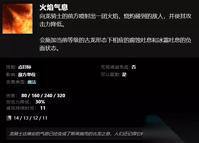 技能介绍 火焰气息 向龙骑士的前方喷射出一团火焰,烧灼碰到的敌人,并使其攻击力降低。 会施加当前等级的古龙形态下相应的腐蚀吐息和冰霜吐息的负面状态。