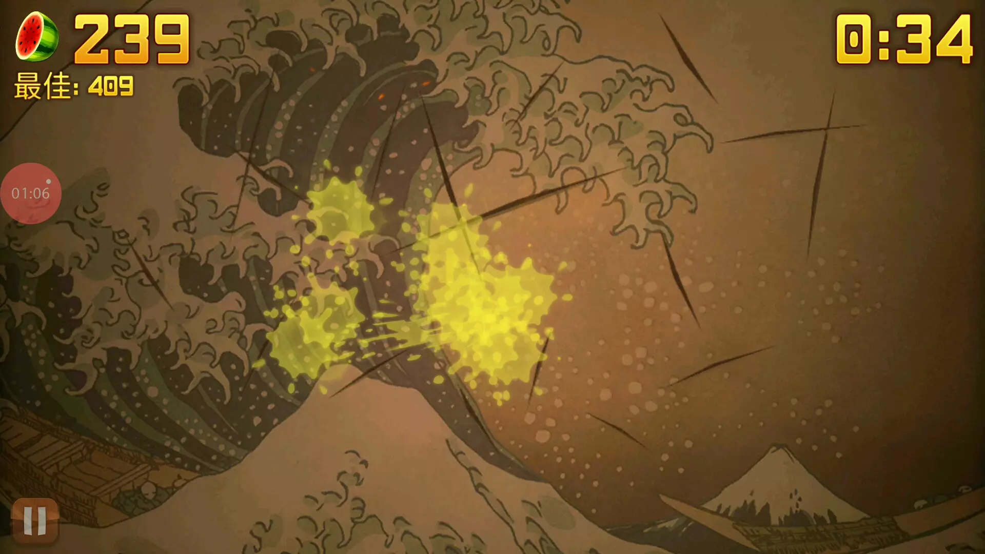 玩家分享经典怀旧游戏《水果忍者》的游玩成果,此次游戏过程中未切到炸弹,成功打破自己此前的游戏纪录,展示了游戏内切割水果获取分数的精彩画面。