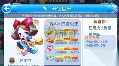 经过多人的激烈残忍的比赛,终于可以看到白雪公主了,一身蓝色优美的衣服,甜美的笑容,小编已经忍不住了拿白雪公主来多人战了,现在就为大家带来白雪公主的多人战视频评测! 【白雪公主多人战属性】 白雪公主在多人对战里面是和超能少年一样属于速度型的角色:抛出公主的礼物,清除障碍并获得能量,会四连跳,满级后属性: 冲锋增强33% 加速地带32% 开局冲锋32% 加速能力32% 道具增强6.5% 伤害抵挡6.4%