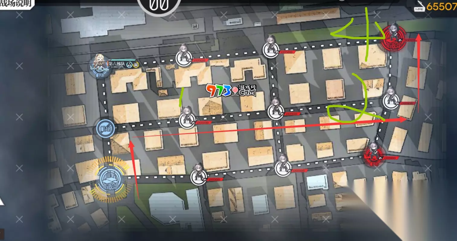 由于总共7步,两个回合会多出来一步,所以需要手动结算。开局之后在机场下一个狗粮并在计划模式时走一步无用步可以实现自动结算,但我怀疑其必要性 如果只是为了刷箱子可以开局下主力+狗粮,走1-2-4的路线一回合自动结算。 阵容 经过测试,可乐+m500的阵容如下站位可以实现低损