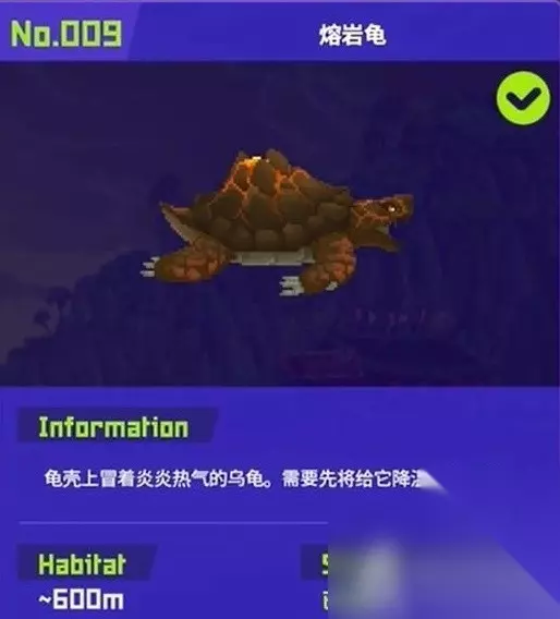 9. 熔岩龟:分布在热喷泉最下方左边的那个副本里,位于600米的海底深处。需要携带寒冰的武器,如冰属性的武器寒冰枪。使用寒冰枪将其冰冻后可以用小刀快速砍击造成伤害,可以将其捕捉。