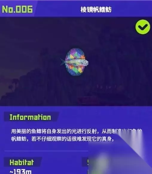 6. 棱镜帆鳍鲂:分布在193米海底海底湖靠右侧的副本海底湖,受到攻击会分裂出两个幻象,幻象受到攻击直接消失。在攻击本体达到一定程度时就可以将其捕捉。