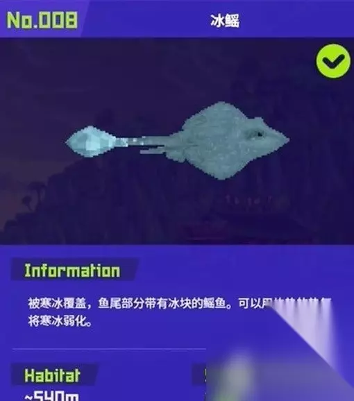 8. 冰鳐:分布在海底540米,滨河区域的第三个洞穴,靠右上方的冰层上,需要携带火属性武器。注意其尾部释放的三道冰柱和冰鳐自带的冲撞甩尾攻击,冰鳐的血量是288,所以需要注意武器的伤害。