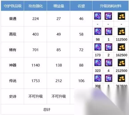 守护珠品级不得高于勋章品级,最高为传说级,守护珠共4颗,单颗守护珠属性及升级所需材料如下: