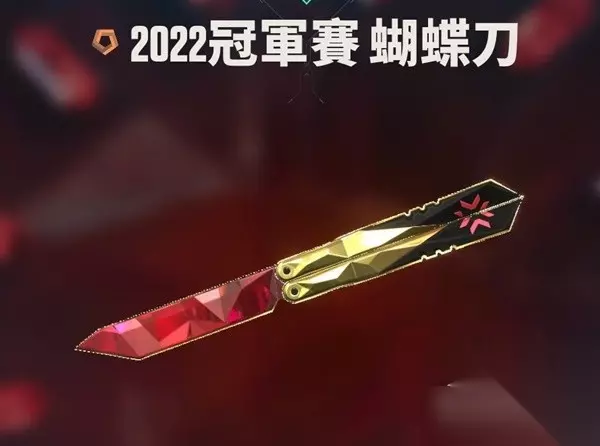 2022冠军赛 蝴蝶刀 口红,进化皮,局内击杀25敌人成为全红宝石,如果击杀数最多还会有金边,同时满足这两个条件后会有冠军奖杯彩蛋。 外服永久绝版,国服上线后大概率会返场,如果对自己的枪法有自信还是很推荐拿下的。