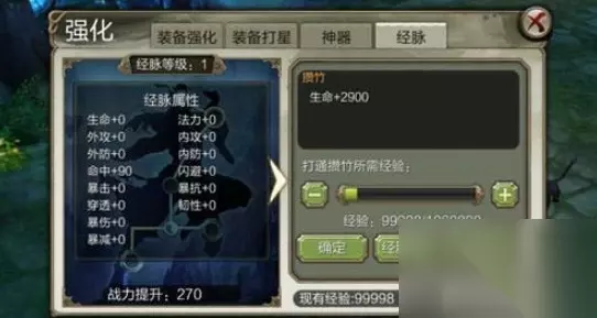 达到91级时开启经脉系统,可消耗经验打通经脉,提升各项属性。 每页经脉分5层,前4个只能按顺序激活,第5个有两个分支,一般的属性选择顺序为: 穿透=暴伤加成=韧性=暴伤减免>内/外功>生命>内/外防>暴击>命中>暴抗>闪避>法力。 经脉系统建议量力而行,后期需要的经验很比,性价比下降。