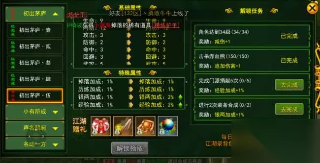 这里是在做的江湖录任务,也属于支线任务的一种,获得的经验较少,大家能清楚的看到等级是低于主线任务的等级,这个时候我们要使用一些道具并且接取支线任务中的悬赏任务和跑环任务,我们使用背包中的高级经验丹,此外告诉大家一个技巧,和他人组队同时也可以提升额外经验,因此最好大家能够组个野队一起做日常的支线任务