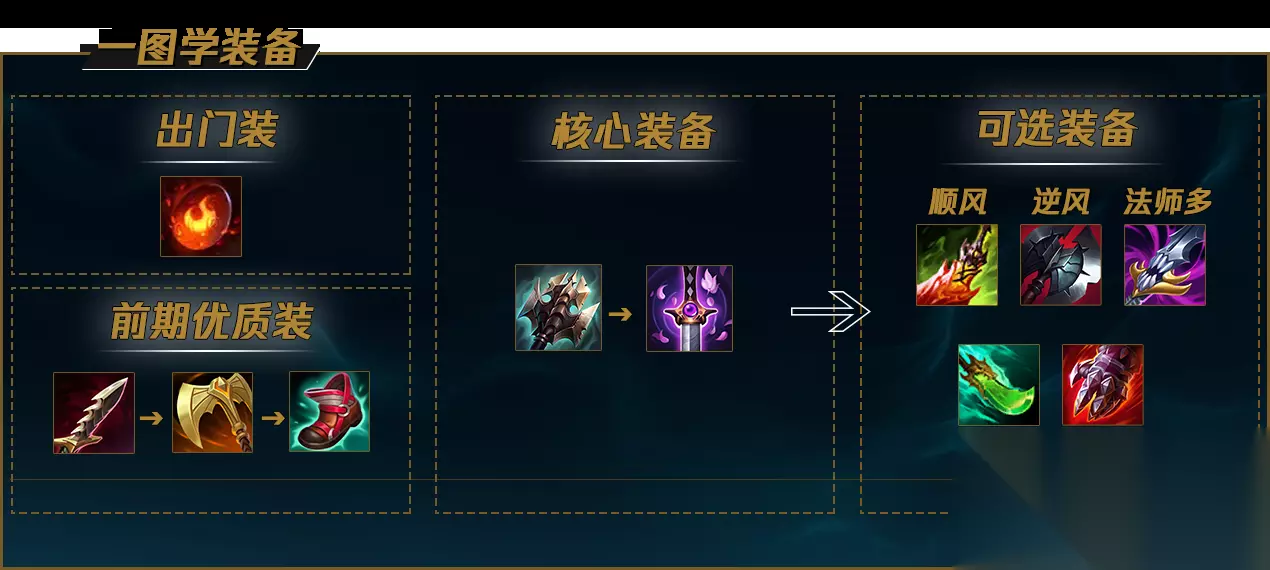之前总有玩家问我为什么不可以带丛刃,那是因为缺少后期的输出,而现在巨九主动效果的回归,使的女王打起架来和带了丛刃的攻速一样,一秒7下!而地图的大改,让女王挖掘隧道变的更加舒坦,抓人效率也大大提高,上下两路的地形对挖机来说就是吃到了版本红利,大家快抓紧这波上分的机会,狠狠上一波大分吧! 装备 我们先介绍下总体按顺序的出装思路: