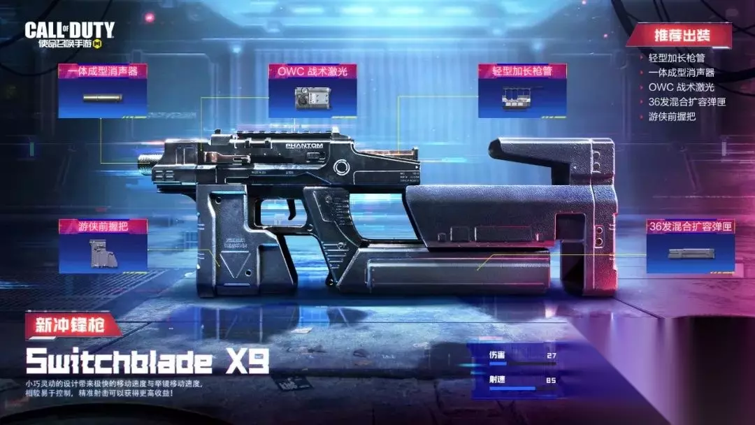 《使命召唤手游》冲锋枪switchbladex9原型介绍 一、switchbladex9 伤害:27 射速:85 精准度:57 机动性:93 射程:50 控制:49 全新登场的Switchblade X9是一把高机动性的轻型冲锋枪,举镜速度很快,中近距离的淘汰效率极高,适宜近身作战。 战士们可以利用枪匠系统,将Switchblade X9改装成腰射跑打的突击利器,也可以强化开镜速度的同时兼顾子弹散布,让其成为中近距离的输出火力。